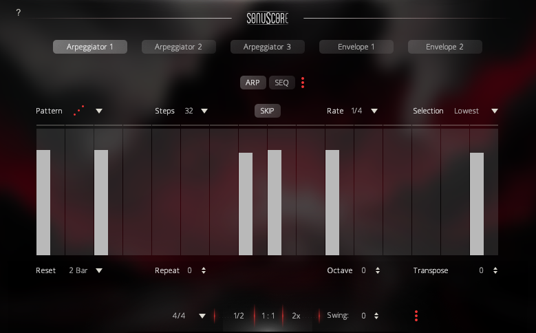 - Skip: Press the SKIP button above the Arpeggiator and steps with the value 0 will be skipped and the respective note will sound at the next active step.