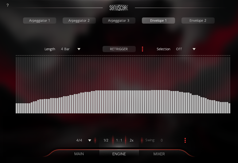 Every instrument can be assigned to one of five different engine modules (Arpeggiator 1-3, Envelope 1/2). By default, the Free Mode is selected, which means the instrument can be played live on your keyboard using modwheel or velocity to control dynamics.