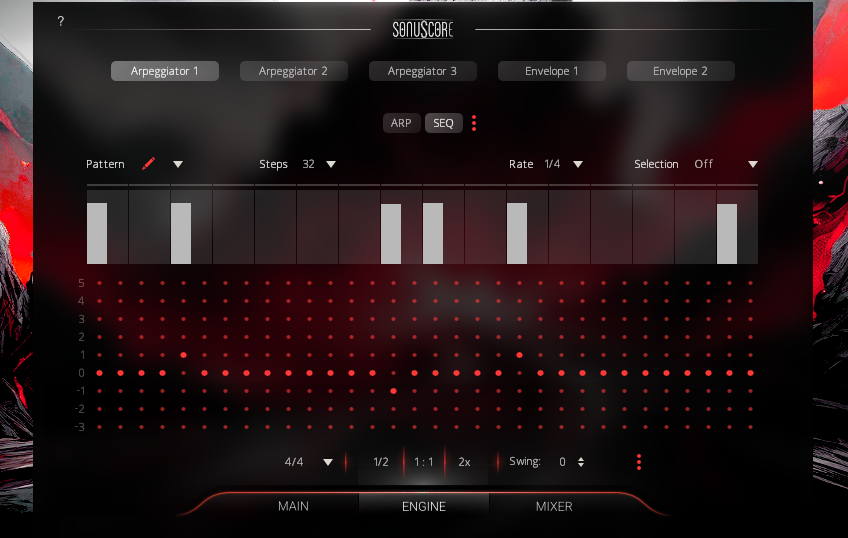 The engine tab initially opens the first arpeggiator.