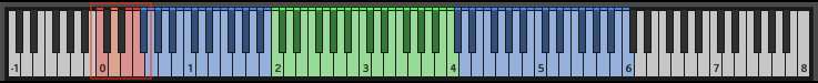 To keep it simple, all non pitched percussion are included in a single patch. In every octave a different instrument is mapped. If a note is played, the instruments name will be displayed in the lower middle of the user interface. The following graphic shows the mapping of the different instruments.