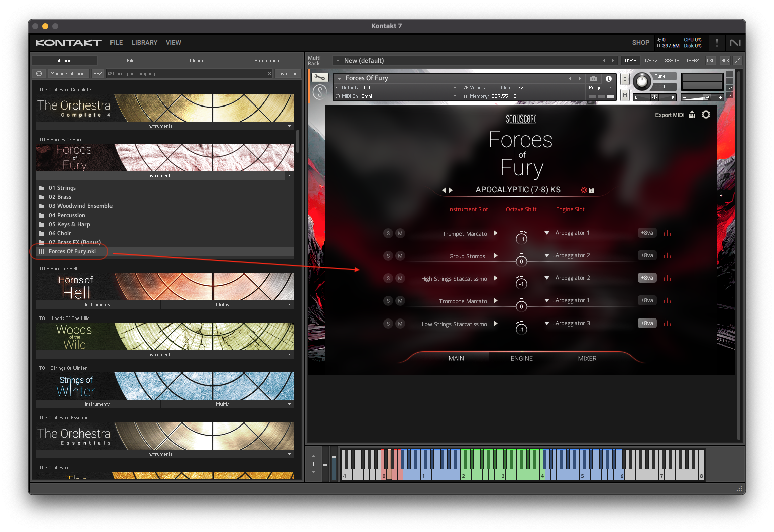 - 5. Double-click the Forces Of Fury.nki file, or drag it into the empty area on the right to load the instrument.