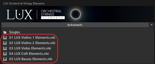 - 5. Double-click for example the 01 LUX Violins 1 Elements.nki file, or drag the .nki to the open space to the right, to load the instrument.